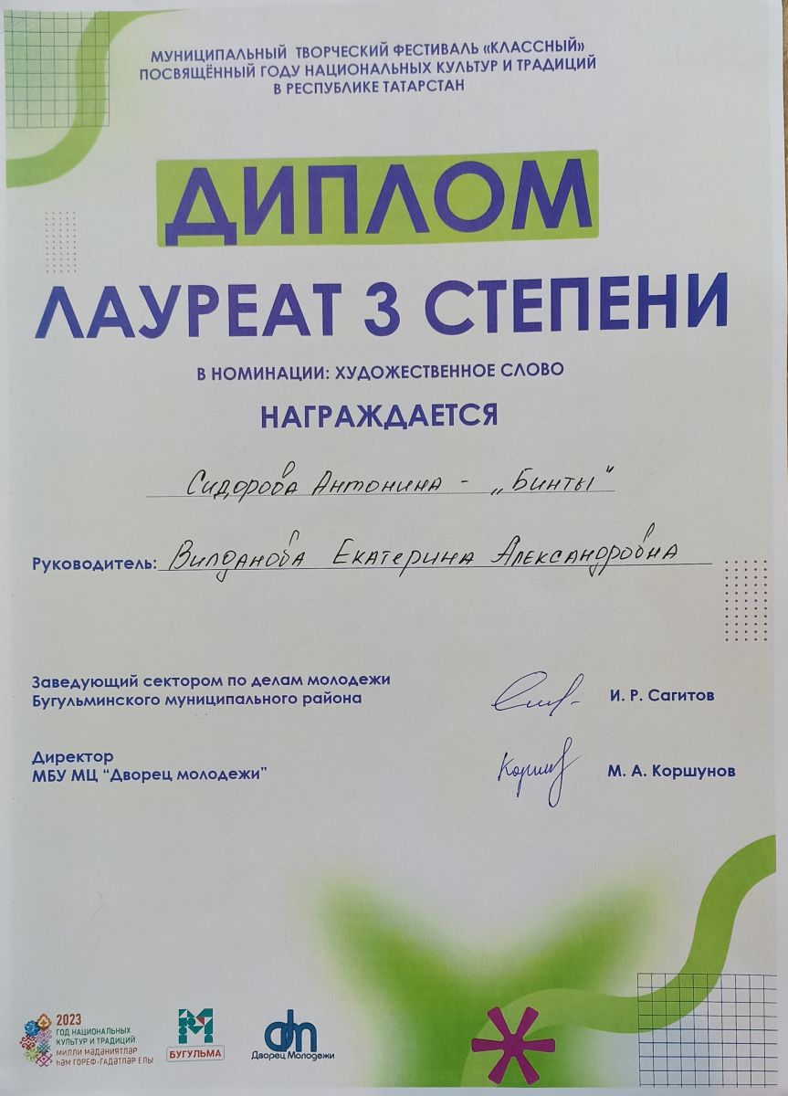 21. Муниципальный творческий фестиваль "КЛАССНЫЙ", посвященный году национальных культур и традиций в Республике Татарстан Сидорова Антонина Диплом лауреат 3 степени .jpg