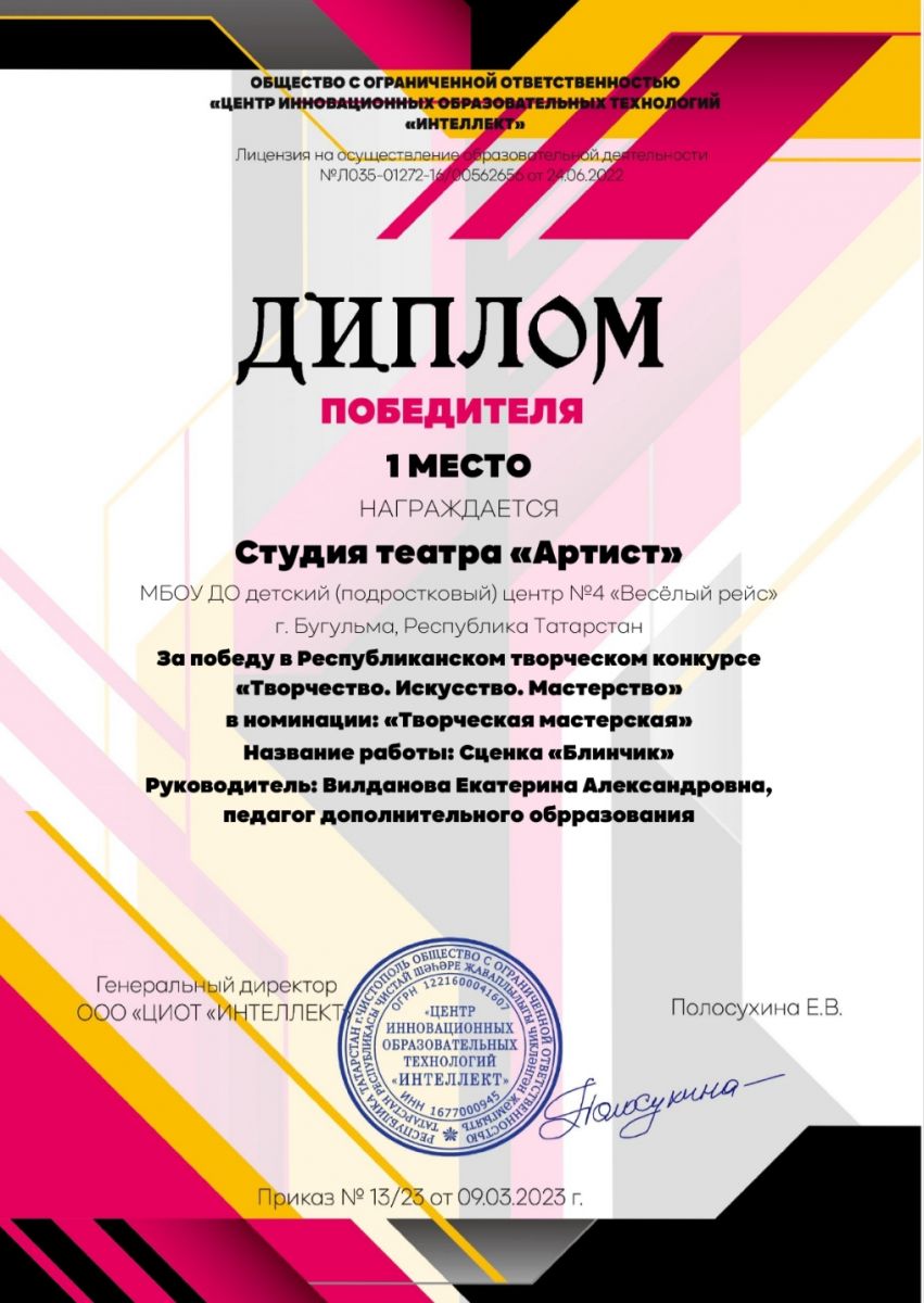 22. Республиканский творческий конкурс "Творчество. Искусство. Мастерство" Студия театра "Артист" Диплом победителя 1 место.jpg