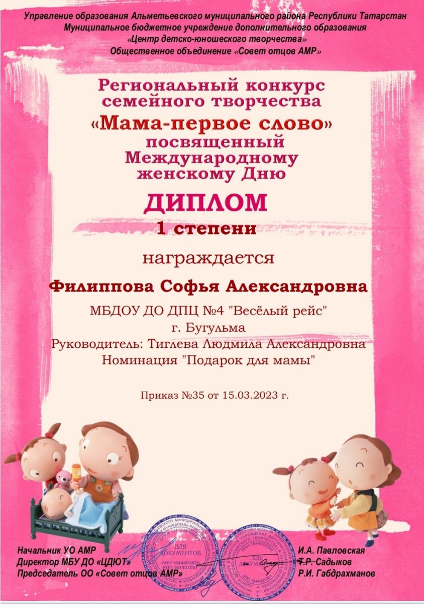 56. Региональный конкурс семейного творчества "Мама-первое слова", посвященный Международному женскому дню Диплом 1 степени Филиппова Софья ИЗОбразjpg