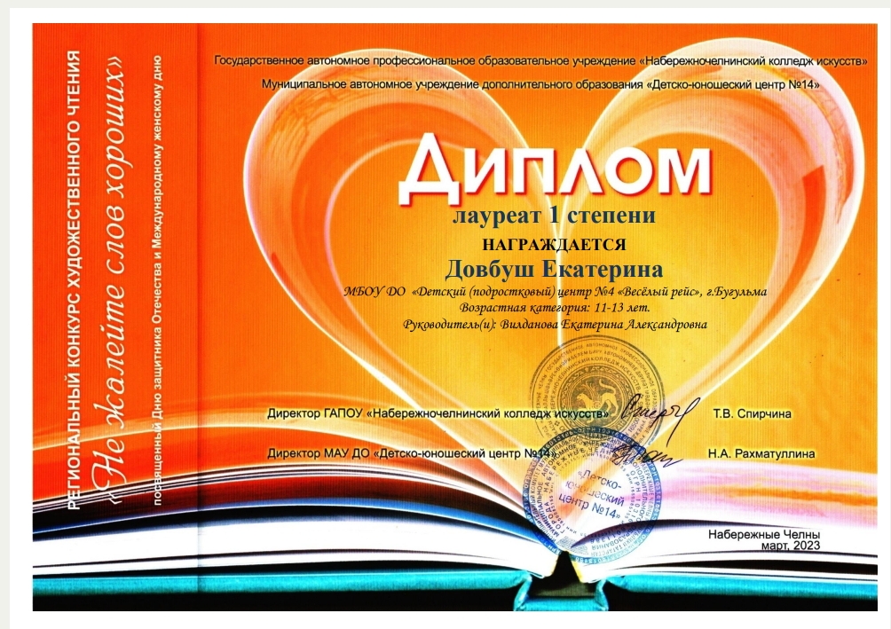 23. Региональный конкурс художественного чтения "Не жалейте слов хороших" Довбуш Екатерина Диплом Лауреат 1 степени.jpg