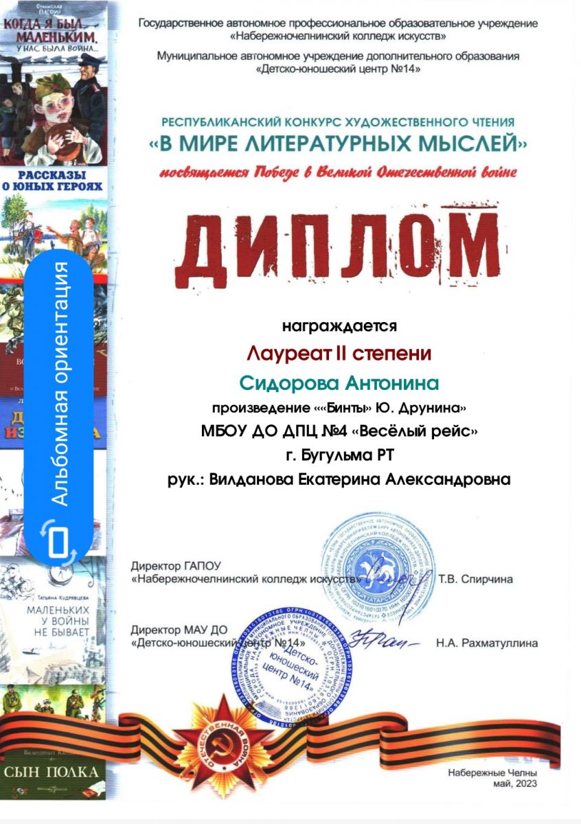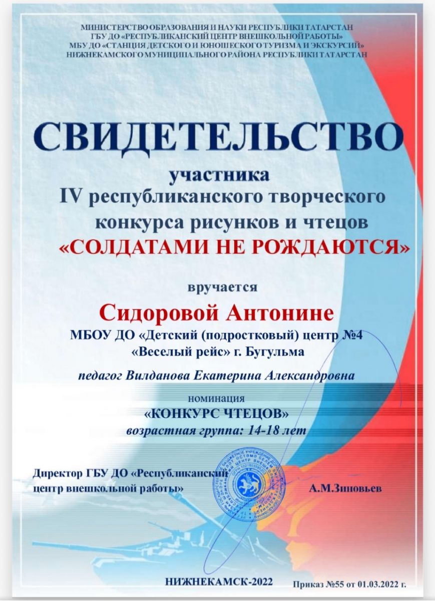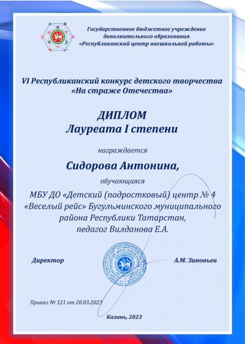 26. VI Республиканский конкурс детского творчества "На страже Отечества" Сидорова Антонина Диплом Лауреат 1 степени.jpg