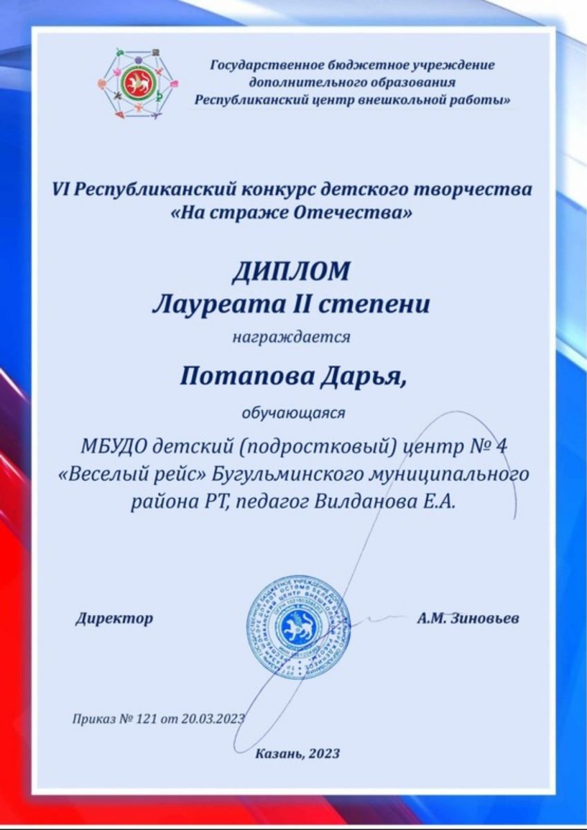 25. VI Республиканский конкурс детского творчества "На страже Отечества" Потапова Дарья Диплом Лауреат 2 степени.jpg
