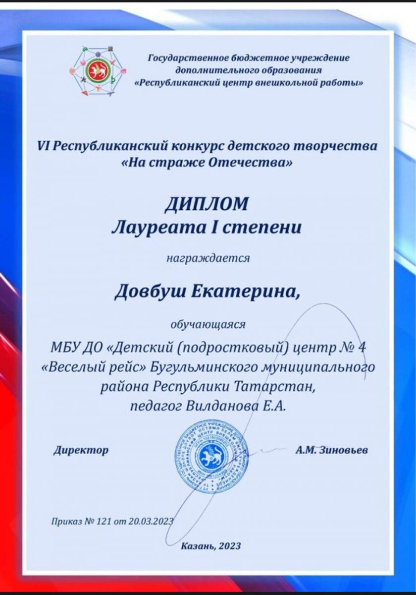 24. VI Республиканский конкурс детского творчества "На страже Отечества" Довбуш Екатерина Диплом Лауреат 1 степени.jpg