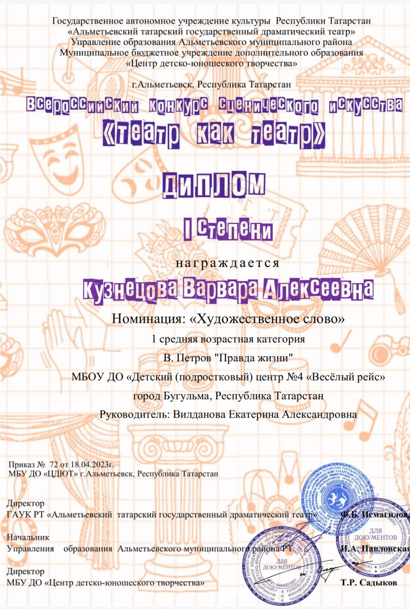 27. Всероссийский конкурс сценического искусства "Театр как театр" Кузнецова Варвара Диплом 1 степени.jpg