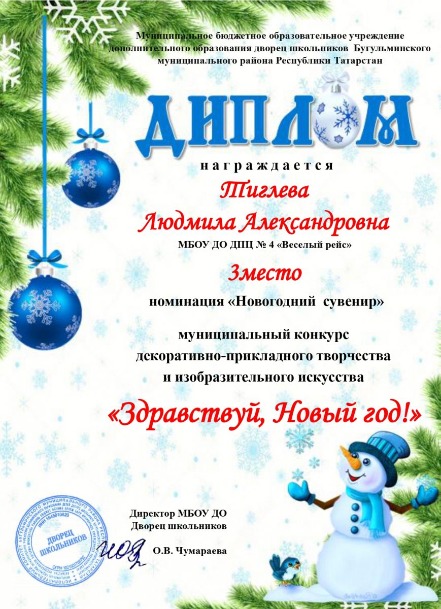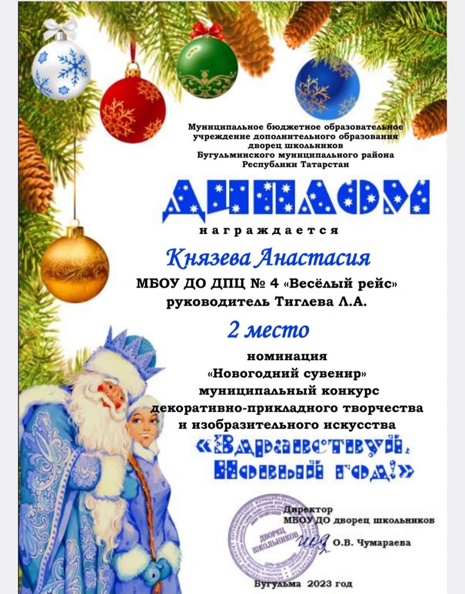 9. Муниципальный конкурс декоративно-прикладного творчества и изобразительного искусства "Здравствуй новый год! 3 местоДиплом