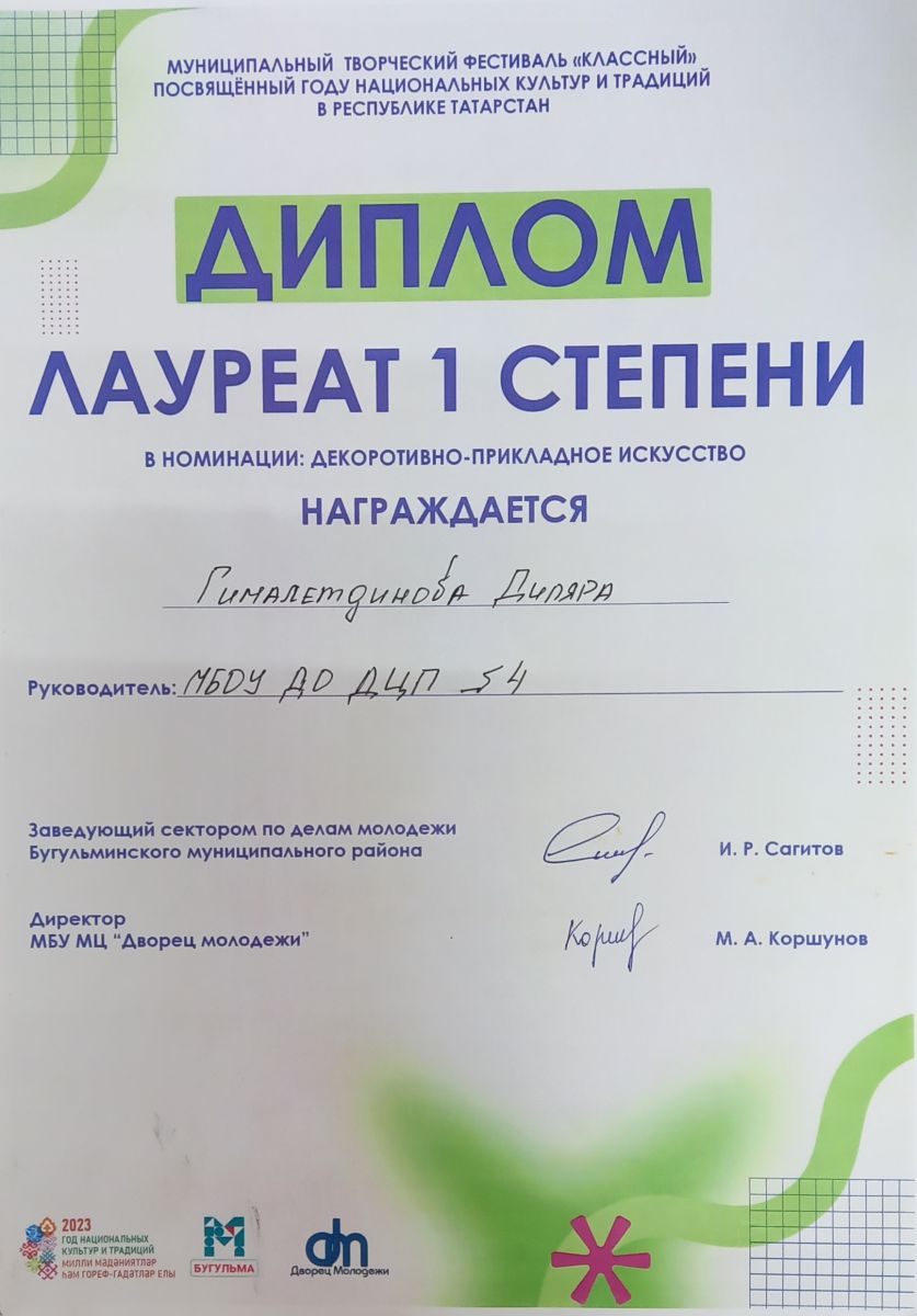 57. Муниципальный творческий фестиваль "Классный", посвященный году национальных культур и традиций в Республике Татарстан Лауреат 1 степени Гималетдинова Диляра ИЗОбраз.jpg