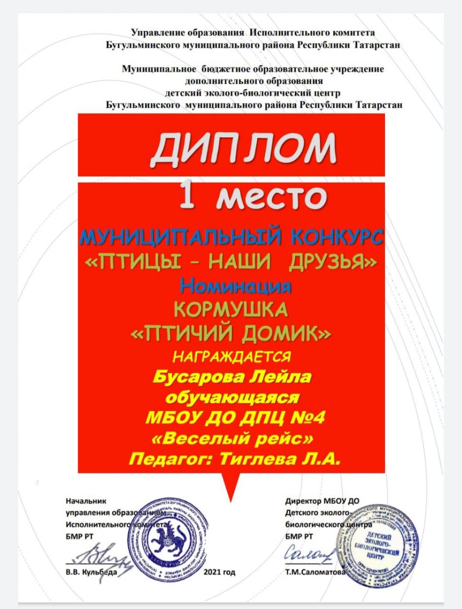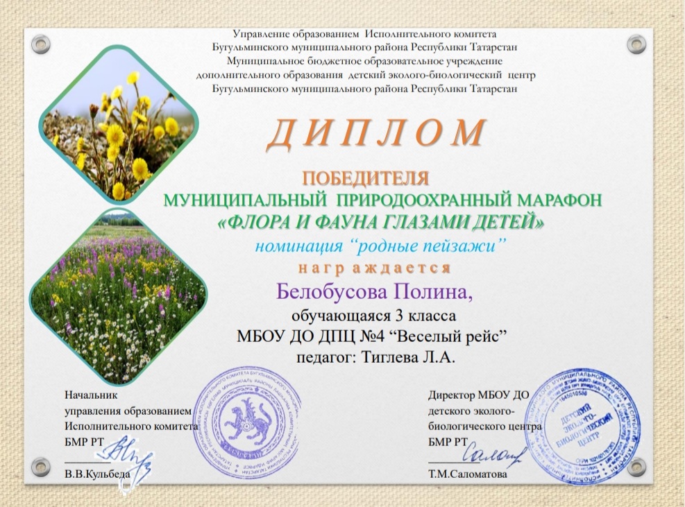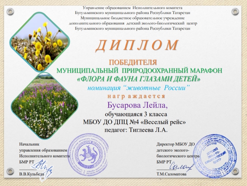 41. Муниципальный природоохранный марафон "Флора и фауна глазами детей" Диплом победителя Бусарова Лейла ИЗОбраз.jpg