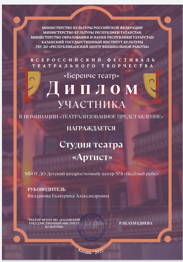 11. Всероссийский фестиваль тетрального творчества "Беренче театр" Студия театра "Артист" Диплом участника.jpg