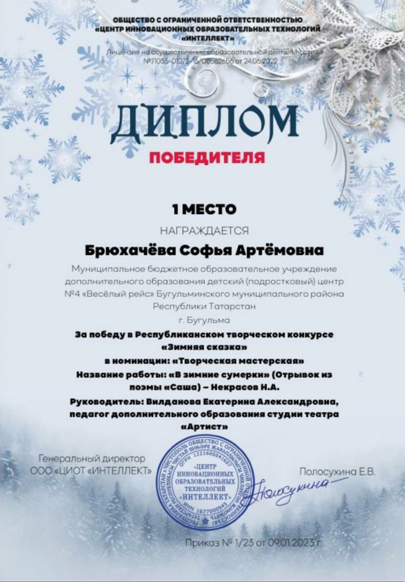 12. Республиканский творческий конкурс "Зимняя сказка" Брюхачёва Софья Диплом победителя 1 место.jpg