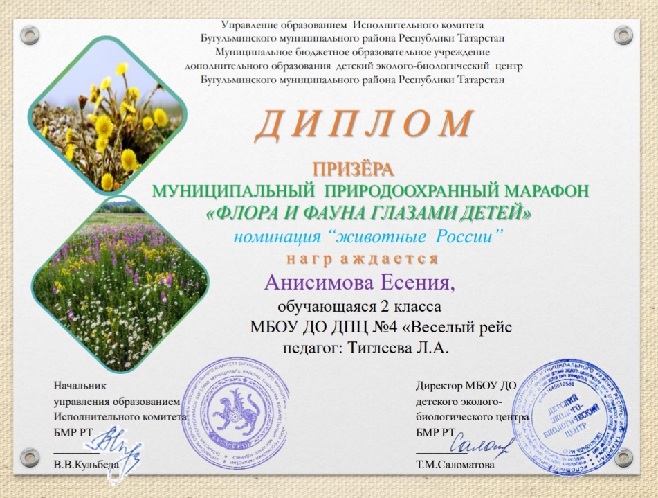 43. Муниципальный природоохранный марафон "Флора и фауна глазами детей" Диплом призёра Анисимова Есения ИЗОбраз.jpg