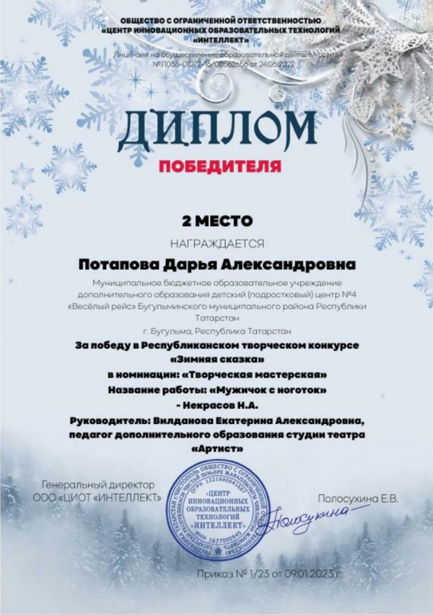 13. Республиканский творческий конкурс "Зимняя сказка" Потапова Дарья Диплом победителя 2 место.jpg