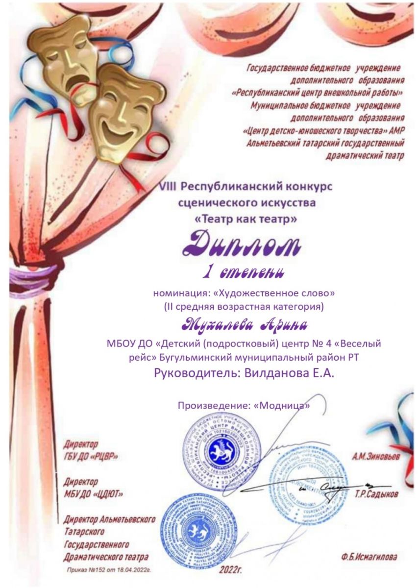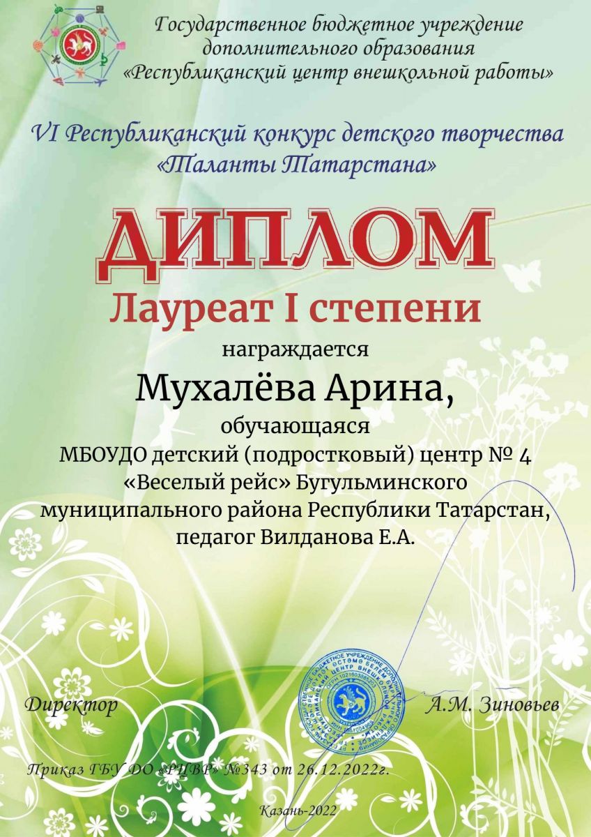 14. VI Республиканский конкурс детского творчества "Таланты Татарстана" Мухалёва Арина Диплом Лауреат 1 степени jpg