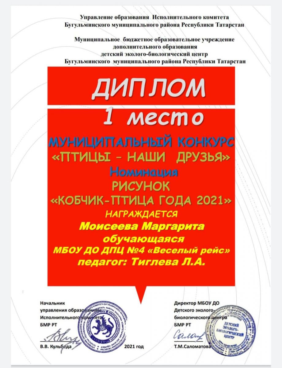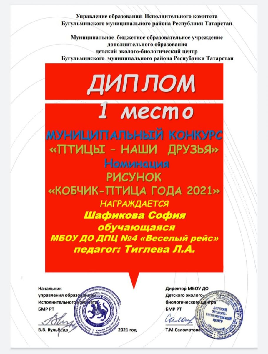 39.Муниципальный конкурс "Птицы наши друзья" 1 место "Рисунок- кобчик года" Диплом