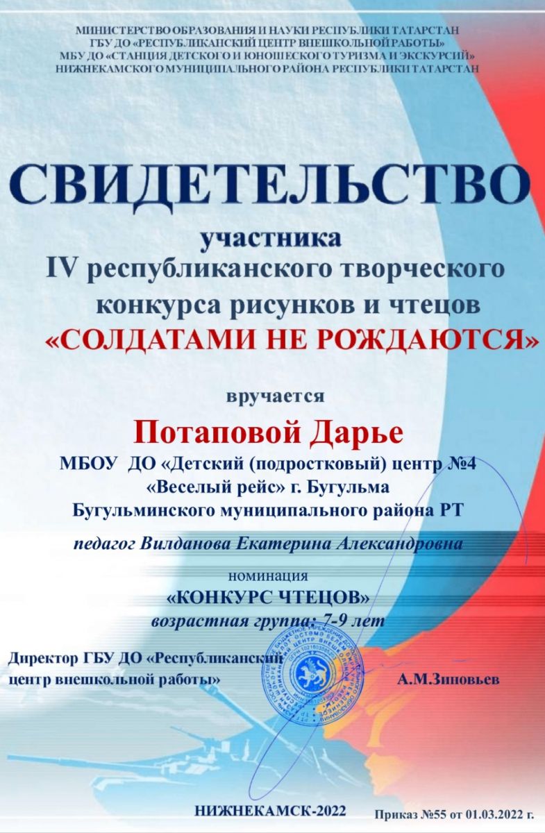 32. IV Республиканский творческий конкурс рисунков и чтецов "Солдатами не рождаются"Свидетельство Потапова Д