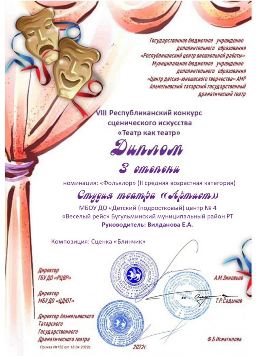 34. VIII Республиканский конкурс сценического искусства "Театр как театр" диплом 3 степениДиплом