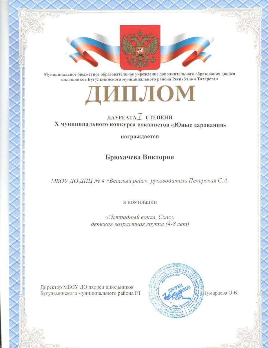 45. Х муниципальный конкурс вокалистов "Юные дарования" Лауреат 1 степени соло Диплом