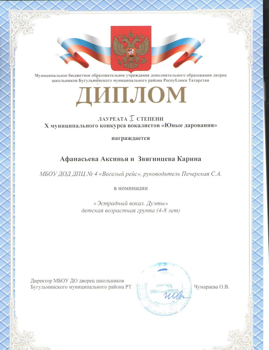 44.Х муниципальный конкурс вокалистов "Юные дарования" Лауреат 1 степени дуэт Диплом