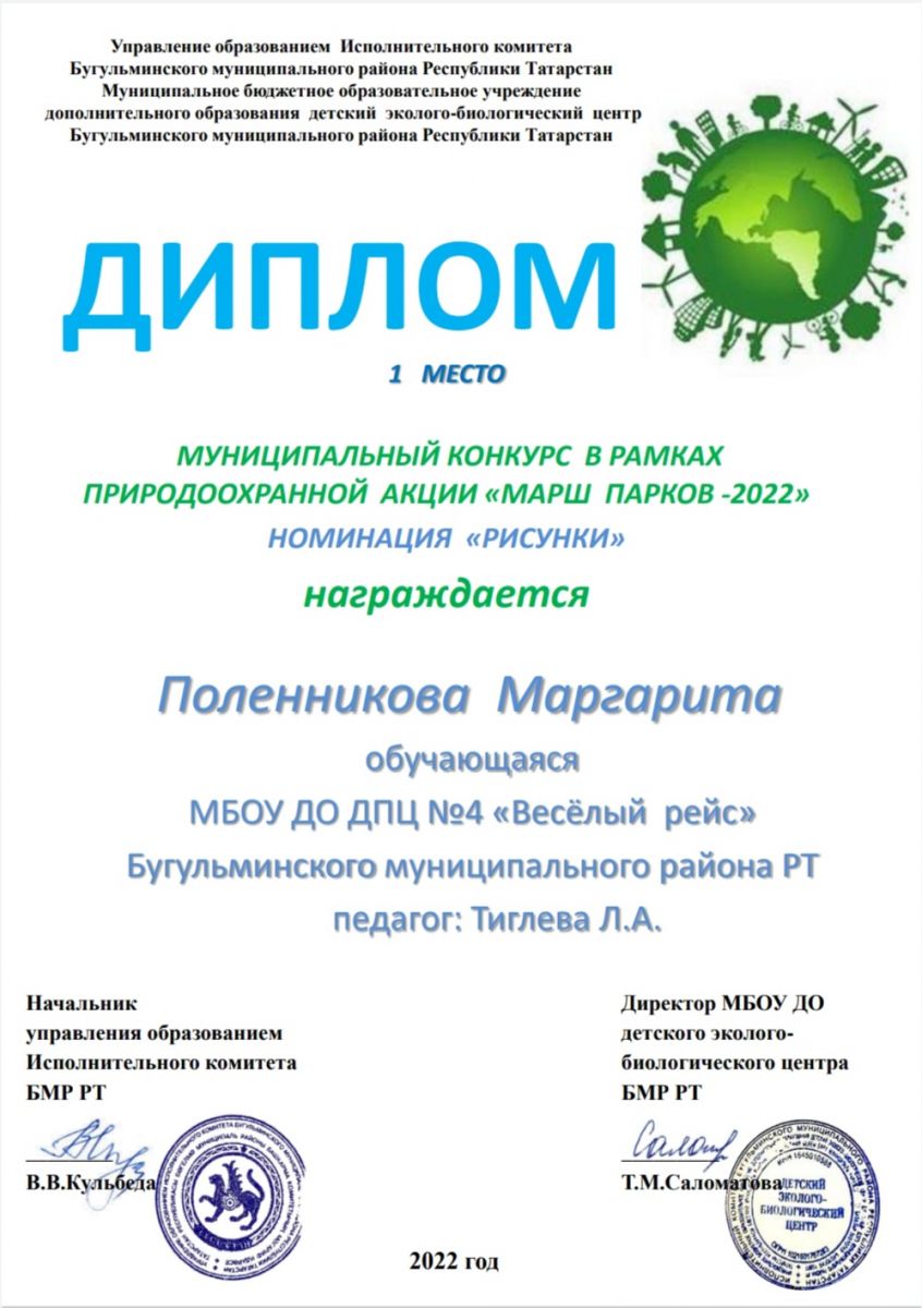 46.Муниципальный конкурс в рамках природоохранной акции "Марш парков" 1 место Диплом