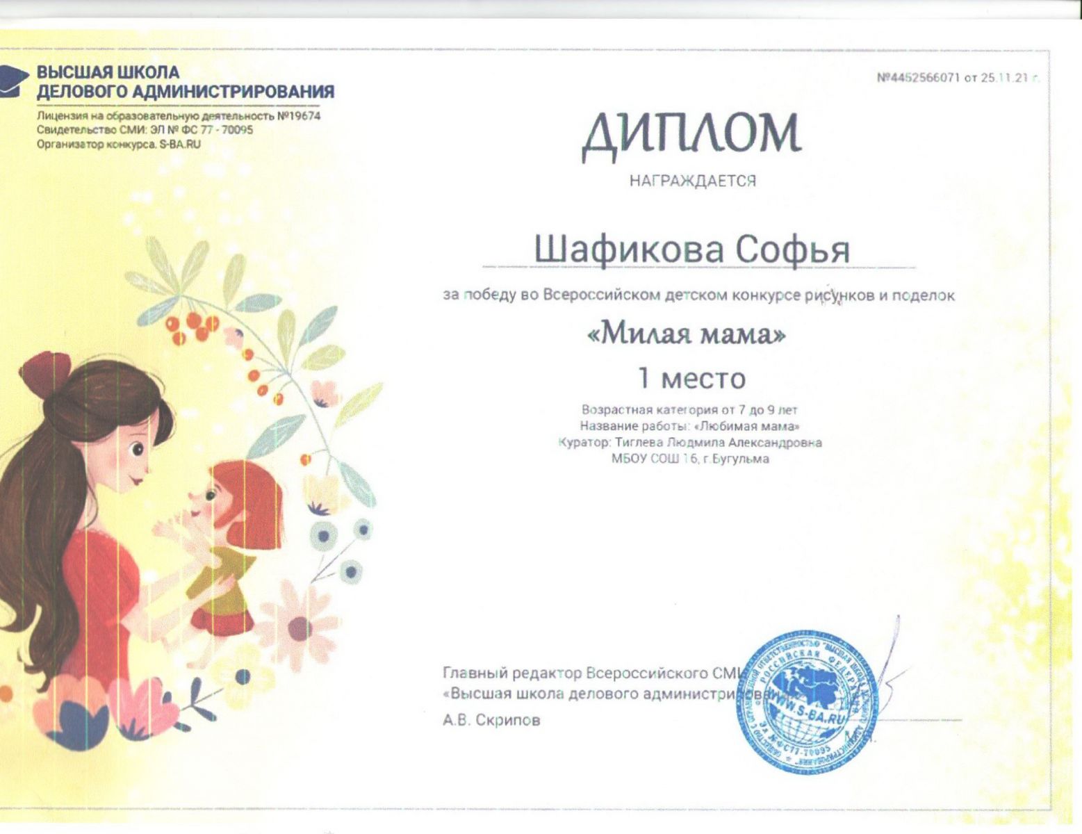1. Всероссийский детский конкурс рисунков "Милая мама" 1 место Диплом