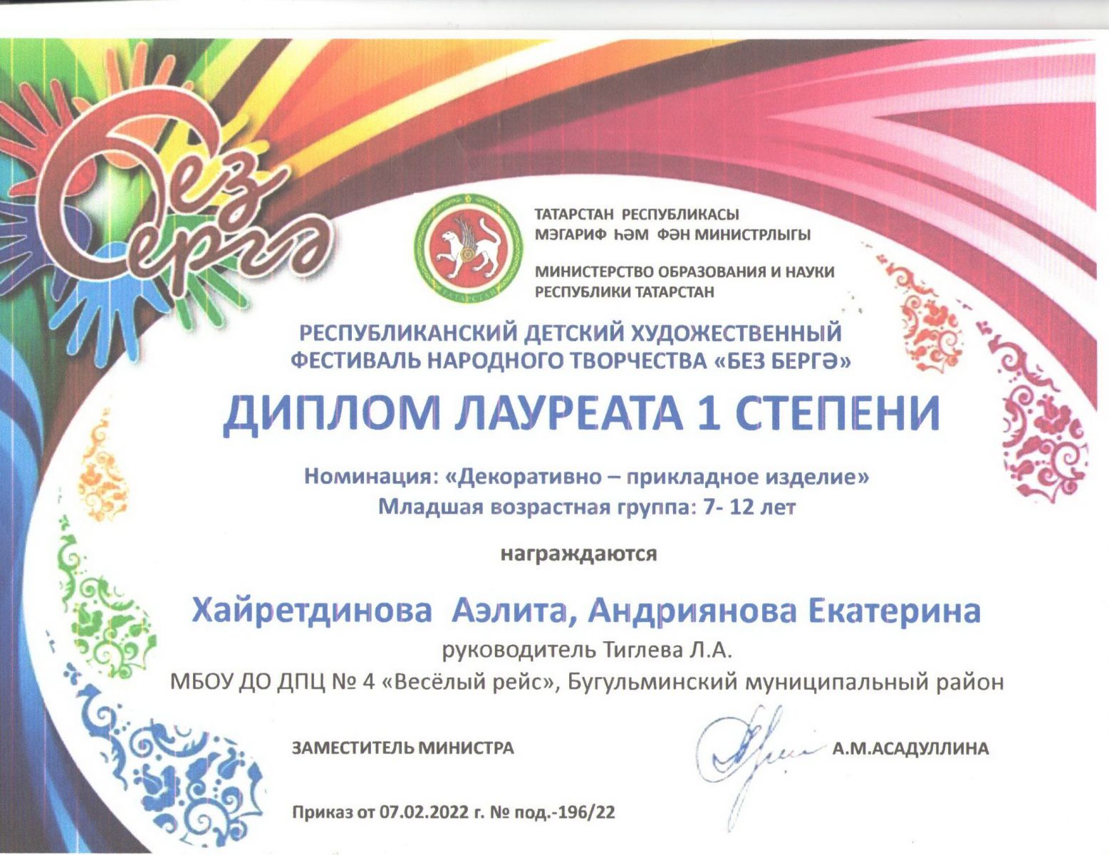 48. Республиканский детский фестиваль народного творчества"Без берге" Диплом лауреата 1 степени Лобачева Ульяна ИЗОбраз.jpg