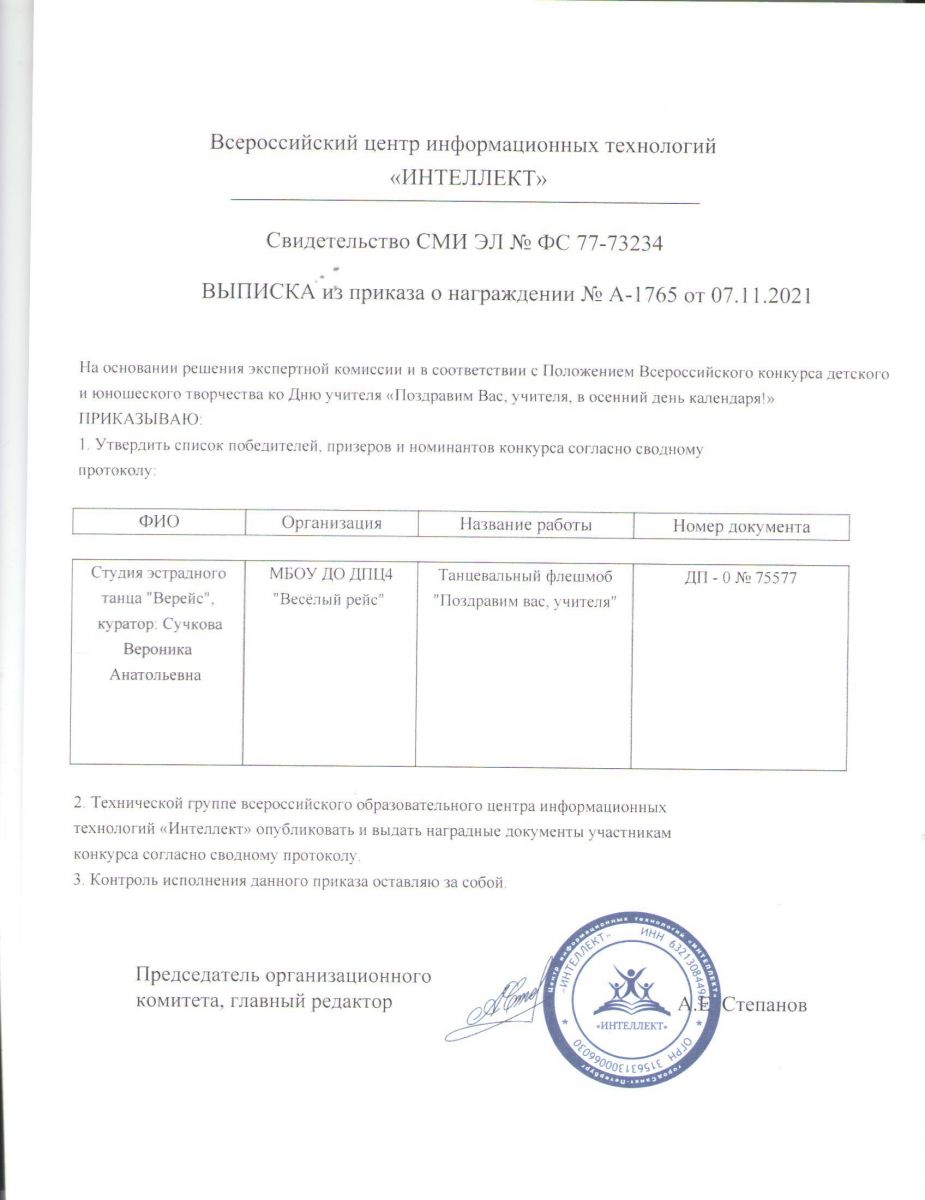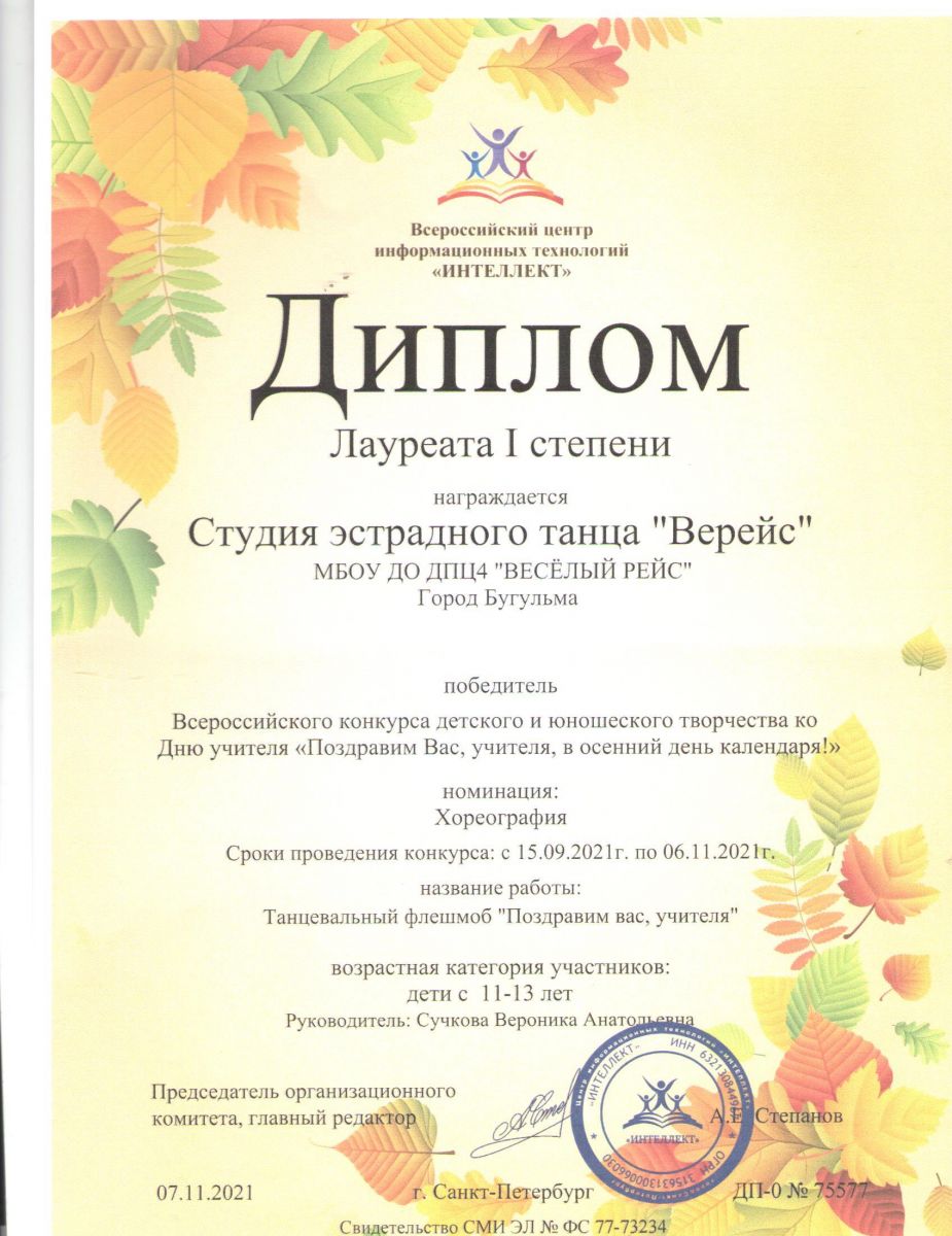 29. Всероссийский конкурс детского и юношеского творчества ко Дню учителя лауреат 1 степени диплом выписка из приказа