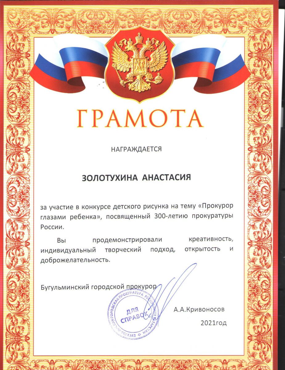 10.Муниципальный конкурс детского рисунка "Прокурор глазами ребенка"Грамота
