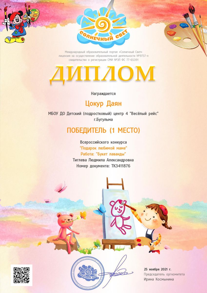 3. Всероссийский конкурс "Подарок любимой маме" 1 место Диплом