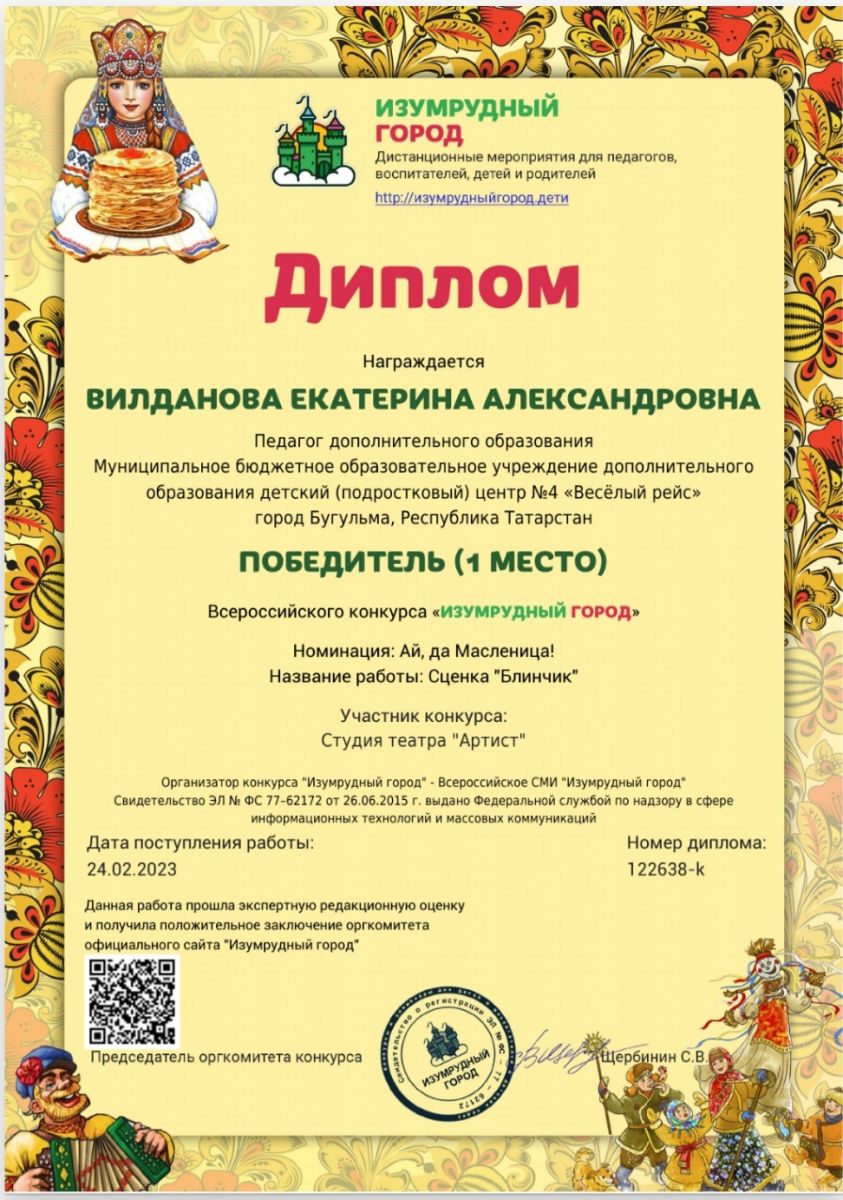 5. Всероссийский конкурс "Изумрудный город", Номинация "Ай, да Масленица!", Диплом победителя (1 место), Вилданова Е.А.jpg