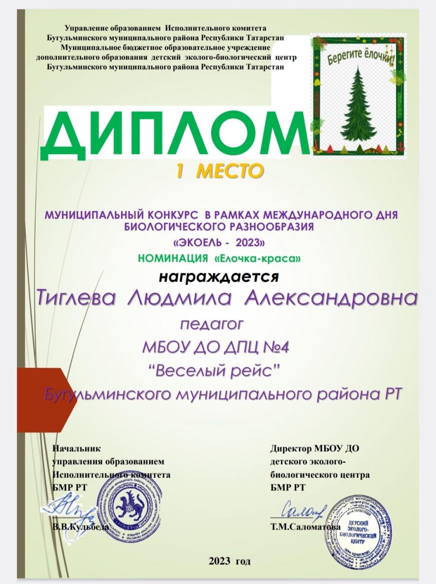 12. Муниципальный конкурс в рамках Международного дня Биологического разнообразия "Экоель - 2023", Диплом 1 место, Тиглева Л.А.jpg
