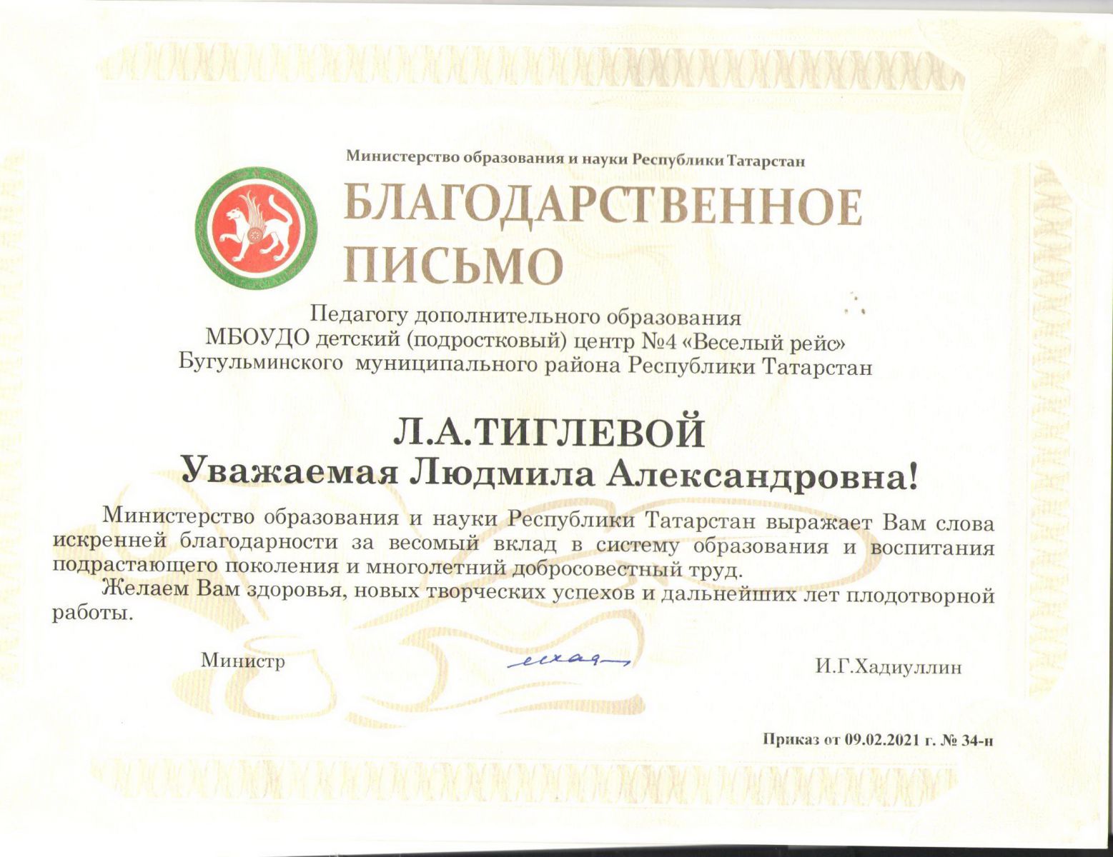 13. Министерство образования и науки Республики Татарстан, Благодарственное письмо за весомый вклад в систему образования, Тиглева Л.А.jpg