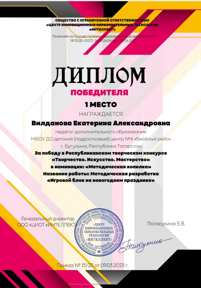 6. Республиканский творческий конкурс "Творчество. Искусство. Мастерство", Номинация "Методическая копилка", Диплом победителя 1 место, Вилданова Е.А.jpg