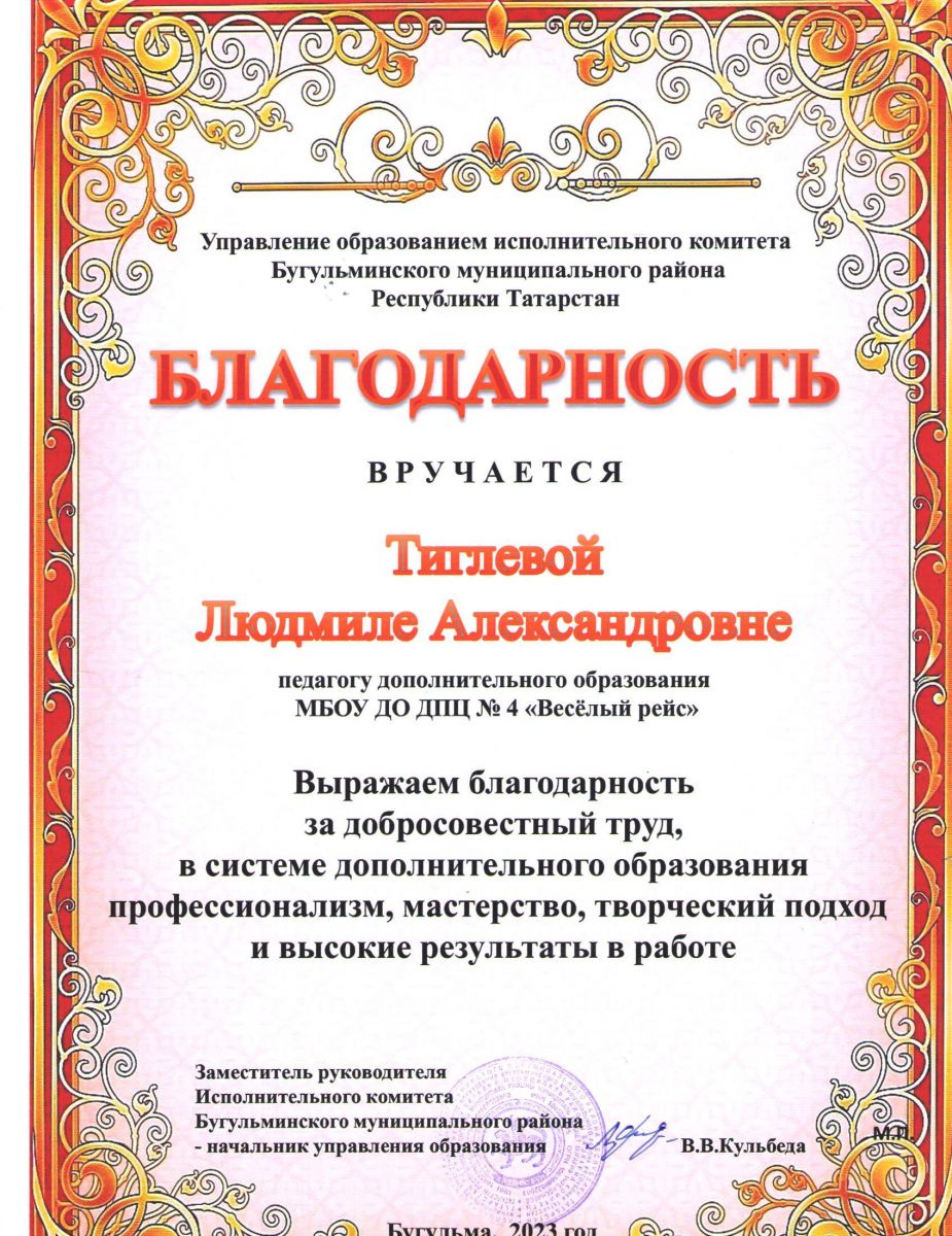 15. Благодарность за добросовестный труд в системе дополнительного образования, Управление образованием исполнительного комитета Бугульминского муниципального района Республики Татарстан, Тиглева Л.А.jpg