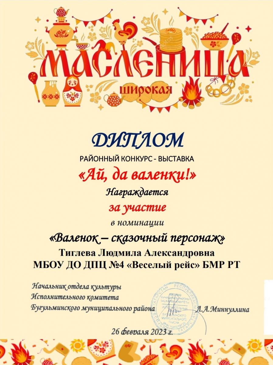 14. Районный конкурс - выставка "Ай, да валенки!", Диплом за участие, Тиглева Л.А.jpg