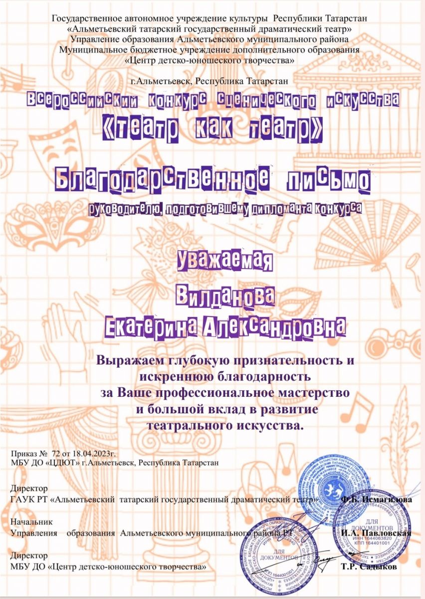 7. Всероссийский конкурс сценического искусства "Театр как театр", Благодарственное письмо руководителю, Вилданова Е.А.jpg