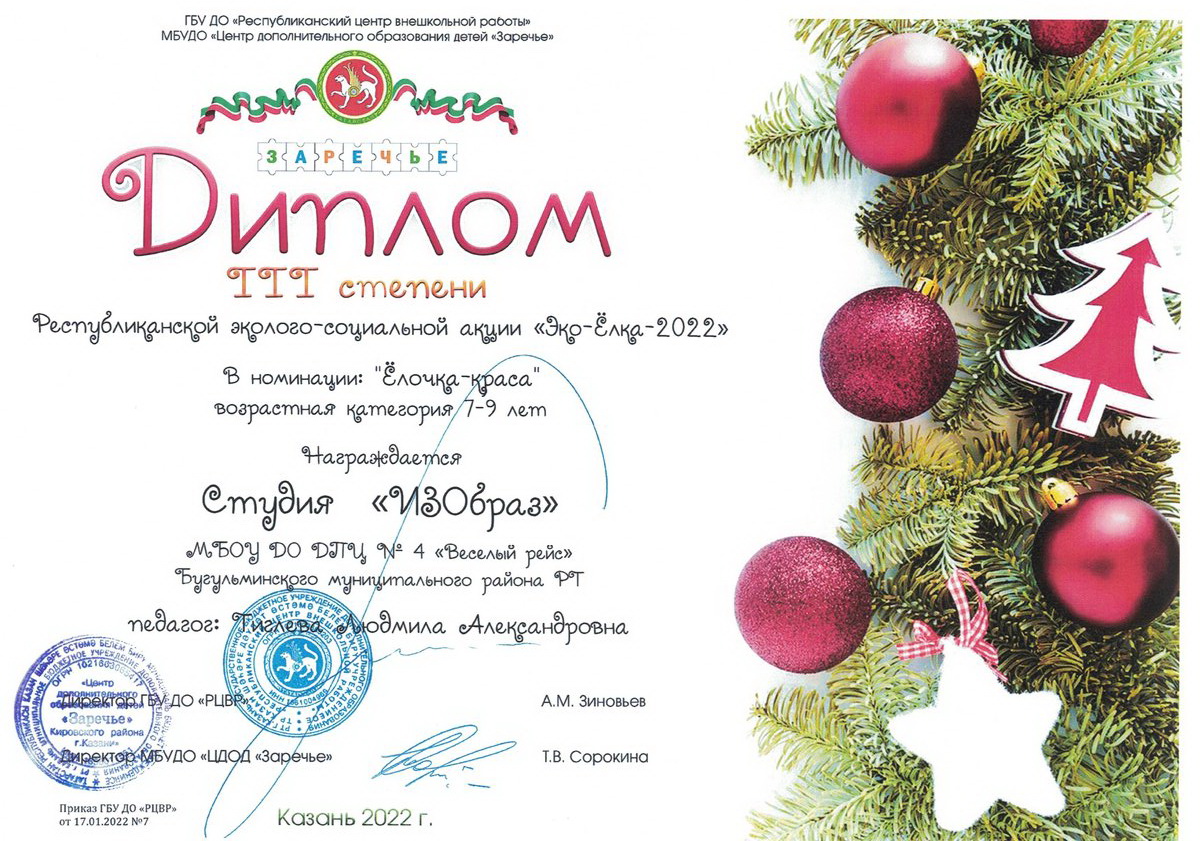 1.Республиканская эколого-социальная акция- конкурс "Эко-елка -2022" 3 место Приказ Диплом