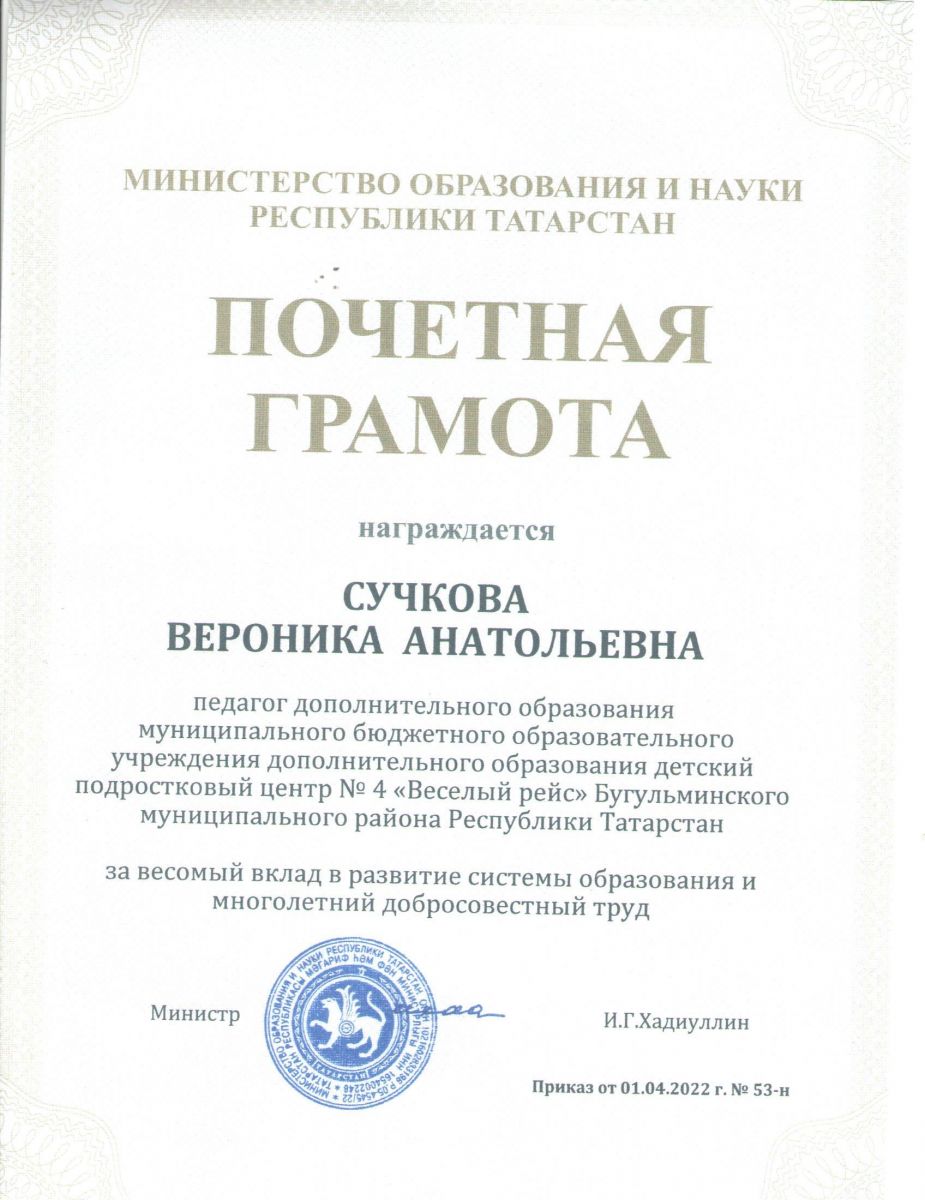 2. Почетная грамота Министерства образования и науки Республики Татарстан .Сучкова В.А. Министерство образования республики Почетная грамота_2.jpg