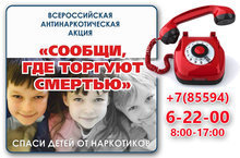С 12 по 23 марта 2018 года в Бугульминском муниципальном районе проходит Общероссийская акция "Сообщи, где торгуют смертью". Номер телефонной линии для приема информации - 6-22-00 с 8.00 до 17.00. В рамках акции организуется проведение профилактической беседы о вреде немедицинского потребления наркотических средств и психотропных веществ, а также об ответственности за участие в их незаконном обороте.