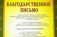 Администрация ГБУ «Центр содействия семейному устройству детей г.Бугульмы» РТ выражает огромную благодарность руководителю танцевального коллектива «Айдан» ДПЦ №7 "Ровесник".