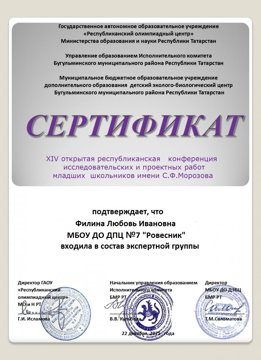 XIV открытая республиканская конференция исследовательских и проектных работ младших школьников имени С.Ф.Морозова Сертификат .jpg