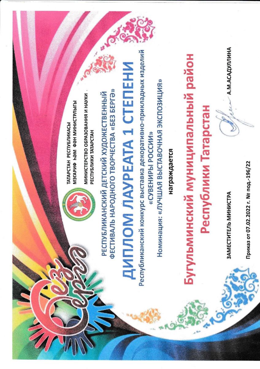 Республиканкий детский художественный фестиваль народного творчества "БЕЗ БЕРГЭ" Лучшая выставочная экспозиция Диплом I место.jpg