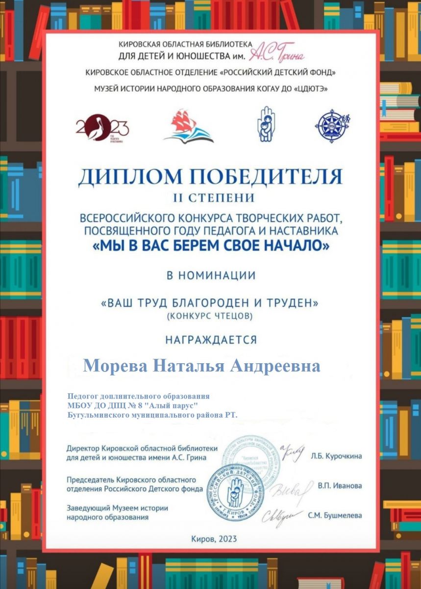 Морева Н А Благодарность Всероссийская