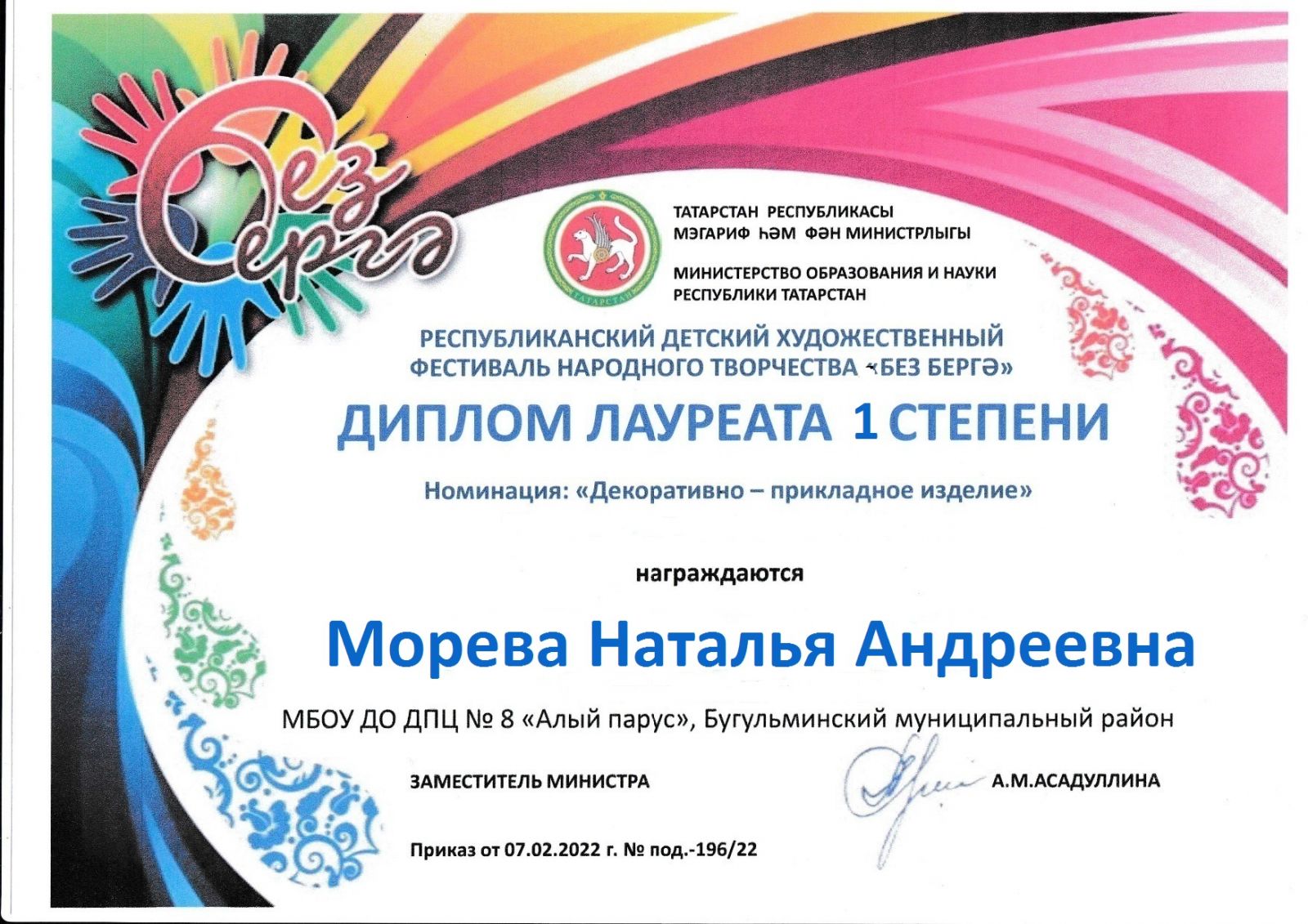 Морева Н А диплом лауреата 1 степени Республика