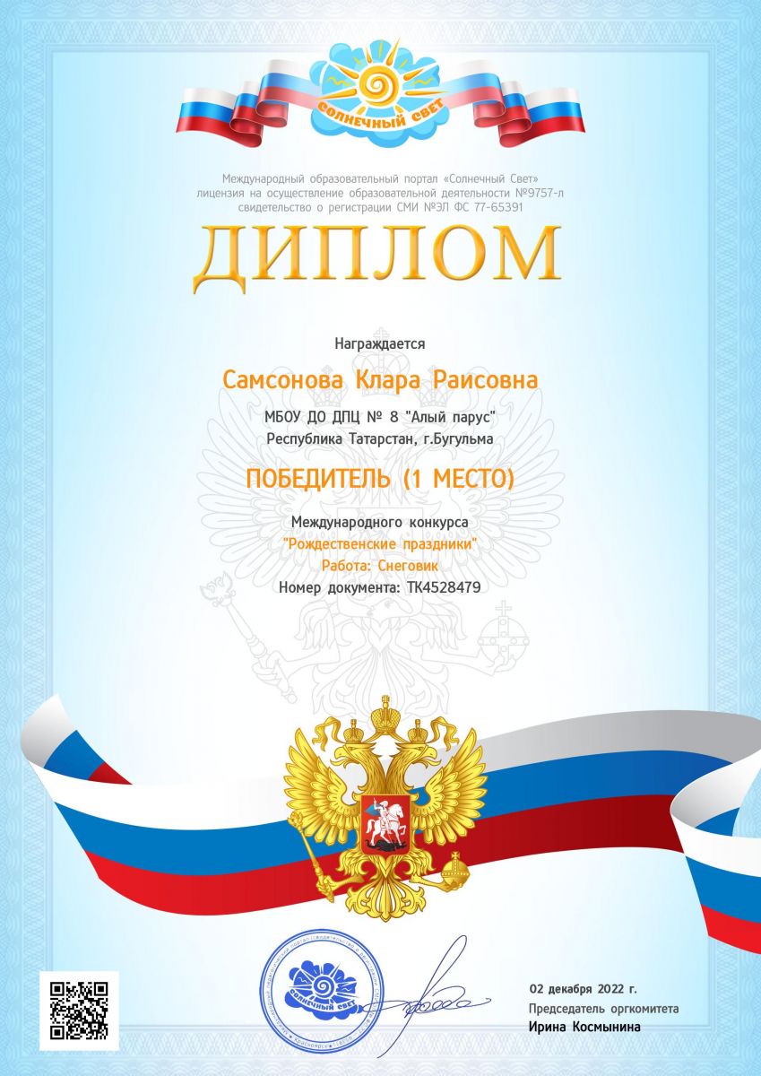 Самсонова Клара Раисовна Сертификат 1 место