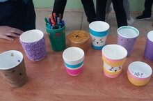 Многие поделки создаются при сочетании различных материалов. Например, если взять за основу пластиковый/бумажный стаканчик, а также воспользоваться нитками для вязания, то получится подставка для карандашей. А мы – педагоги и дети люди творческие и сообразительные, всему и всегда находим применение, вот и такие баночки не остались без присмотра.