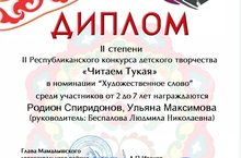 Поздравляем Максимову Ульяну и Спиридонова Родиона, воспитанников подготовительной группы, с победой в Республиканском конкурсе детского творчества «Читаем Тукая» в номинации «Художественное слово».