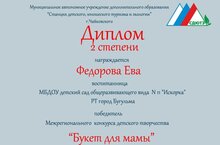 Поздравляем Федорову Еву, воспитанницу средней группы с победой в межрегиональном конкурсе детского творчества «Букет для мамы»