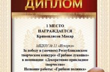 Пздравляем воспитанников и педагогов детского сада с победой в Республиканском творческом конкурсе “Грибное лукошко” в номинации “Декоративно-прикладное творчество”: