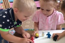 Дети рисовали на ткани фломастером разные узоры, затем поливали рисунки водой, и наблюдали за тем, как расплываются разноцветные пятна, и получается очень необычно и красиво! Провели опыт со стаканом и салфеткой. Салфетку положили на дно стакана, а стакан опустили в тазик с водой. Оказалось, что если стакан ставить в воду прямо, то салфетка не намокает, так как в стакане образуется воздушный карман. Поэкспериментировали с шариками. Узнали, что они электризуются от ткани или волос, и хорошо держатся на стене. Устроили гонки машинок с прикрепленными к ним шарами. Так как шарики выпускали воздух, машинки ехали сами и очень быстро. А еще, дети попробовали интересный фокус. Налили в стакан воды, а затем, положив на него лист бумаги, перевернули. Вода не вылилась!