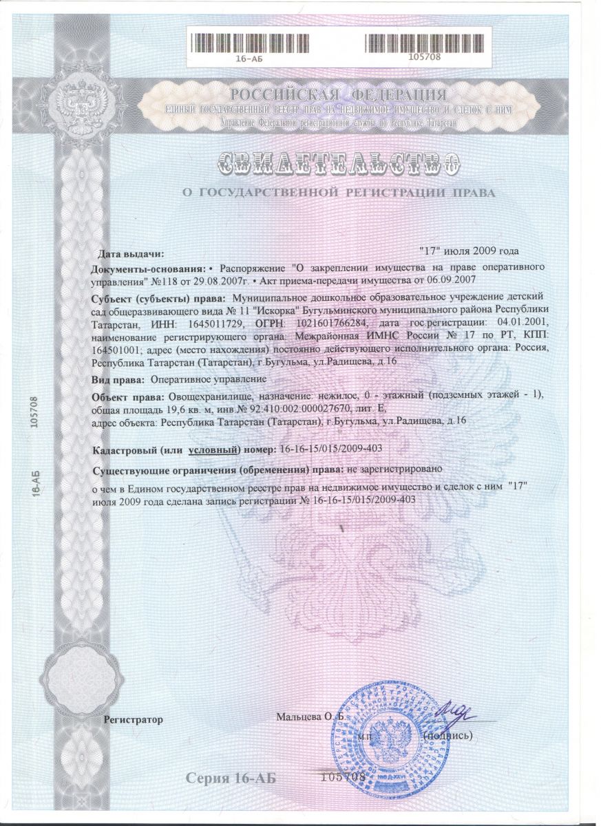 Свидетельство о государственной регистрации права серия 16-АБ № 105708