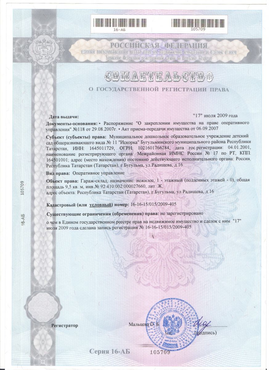 Свидетельство о государственной регистрации права серия 16-АБ № 105709